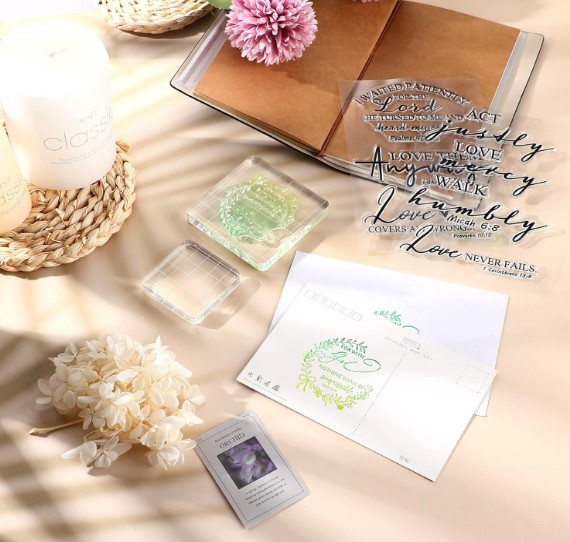 Stamp sets featuring faith-related images and sentiments come with ink pads in various colors. They allow users to repeatedly add consistent designs and lettering to their journal pages.